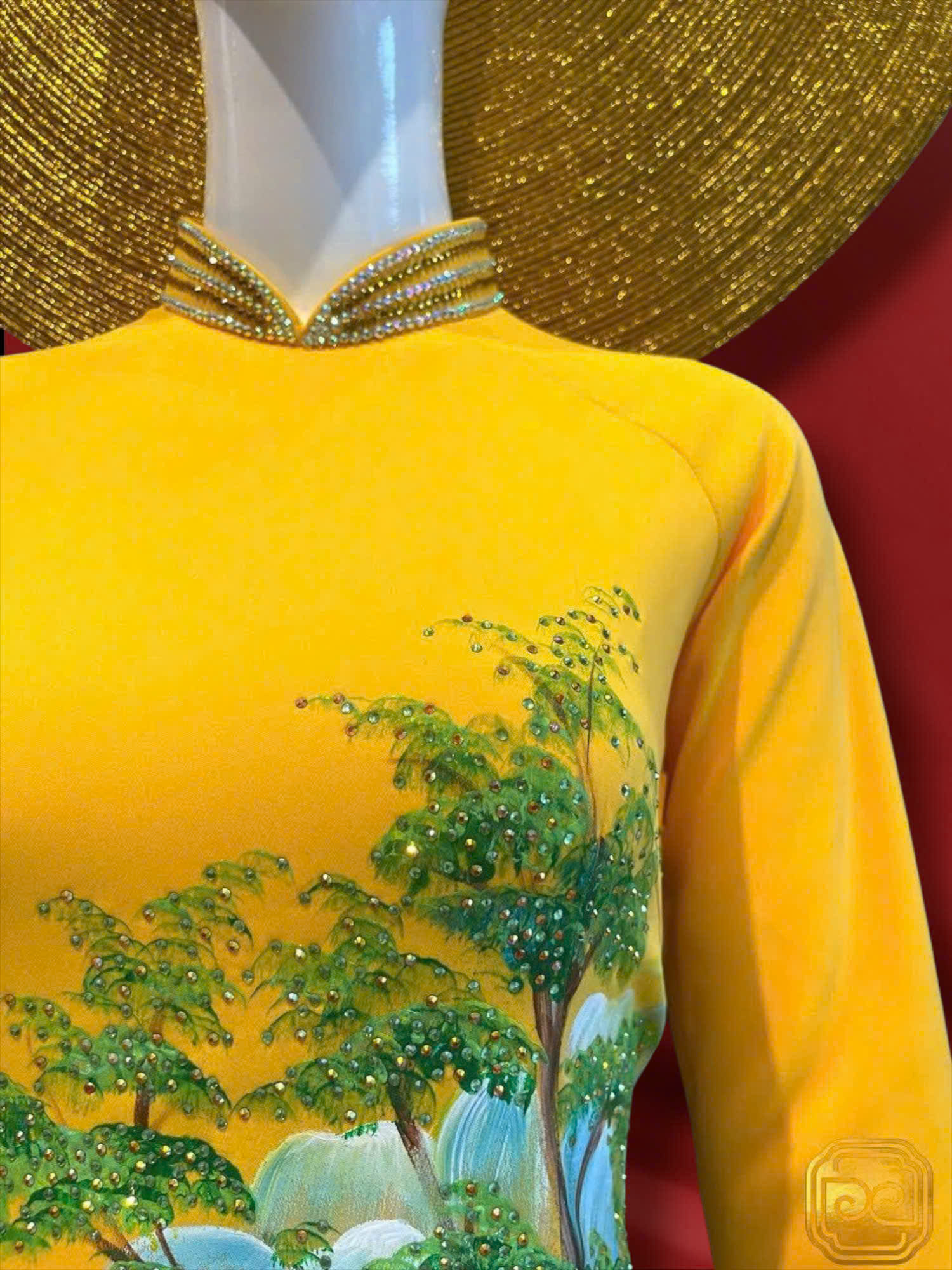 Lấy cảm hứng từ vẻ đẹp thiên nhiên mùa hạ, chiếc áo dài vẽ tay “Hạ Vân” mang đến cảm giác nhẹ nhàng và tinh khôi như áng mây trôi trên nền trời xanh. Từng nét cọ được họa sĩ khắc họa uyển chuyển, tái hiện hình ảnh hoa cỏ, mây trời và ánh nắng mùa hạ bằng gam màu trong trẻo, mềm mại. Trên nền lụa tơ cao cấp, mỗi chi tiết đều toát lên vẻ thanh thoát và sự sống động của thiên nhiên, giúp người mặc như hòa mình vào không gian trong lành, tươi sáng. “Hạ Vân” không chỉ là một chiếc áo dài, mà là bức họa của cảm xúc và tâm hồn Việt – dịu dàng, tinh tế và đầy thi vị.