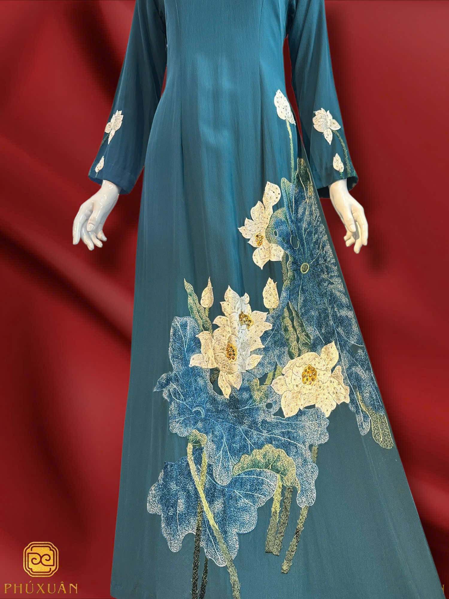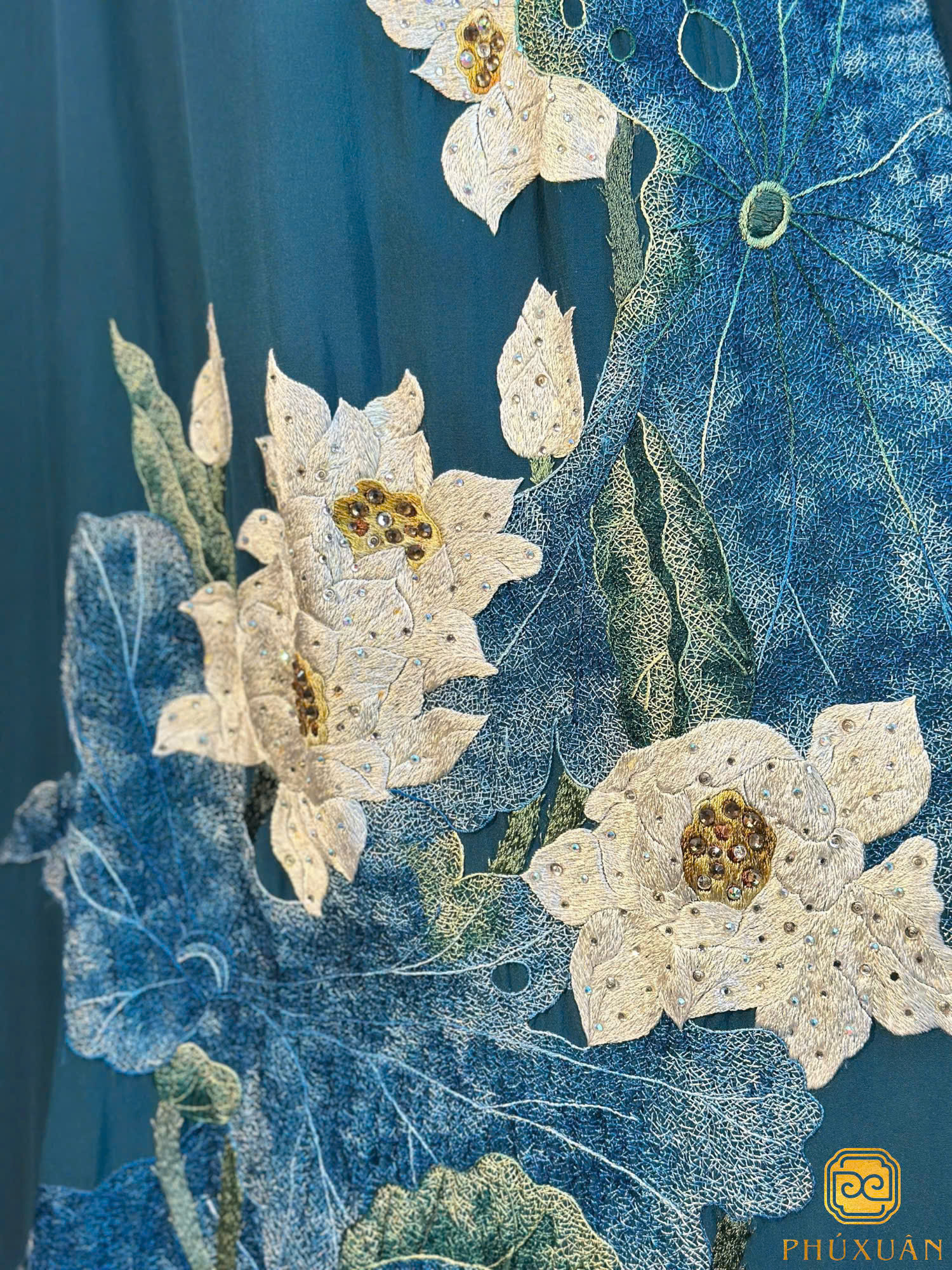 Chiếc áo dài mang tên “Ngọc Liên” là sự kết hợp tinh tế giữa vẻ đẹp thuần khiết và truyền thống Việt. Trên nền lụa xanh nhã nhặn, những bông sen trắng được thêu tay tỉ mỉ, hiện lên như biểu tượng của sự thanh cao và tâm hồn trong sáng. Mỗi đường kim mũi chỉ được người thợ Huế gửi gắm vào đó tình yêu với nghệ thuật thêu tay cổ truyền, tạo nên một tác phẩm không chỉ để mặc mà còn để cảm nhận. “Ngọc Liên” gợi nên hình ảnh người phụ nữ Việt – dịu dàng, thanh lịch mà vẫn kiên cường, như bông sen vươn mình giữa hồ nước trong, tỏa hương giữa đời thường.