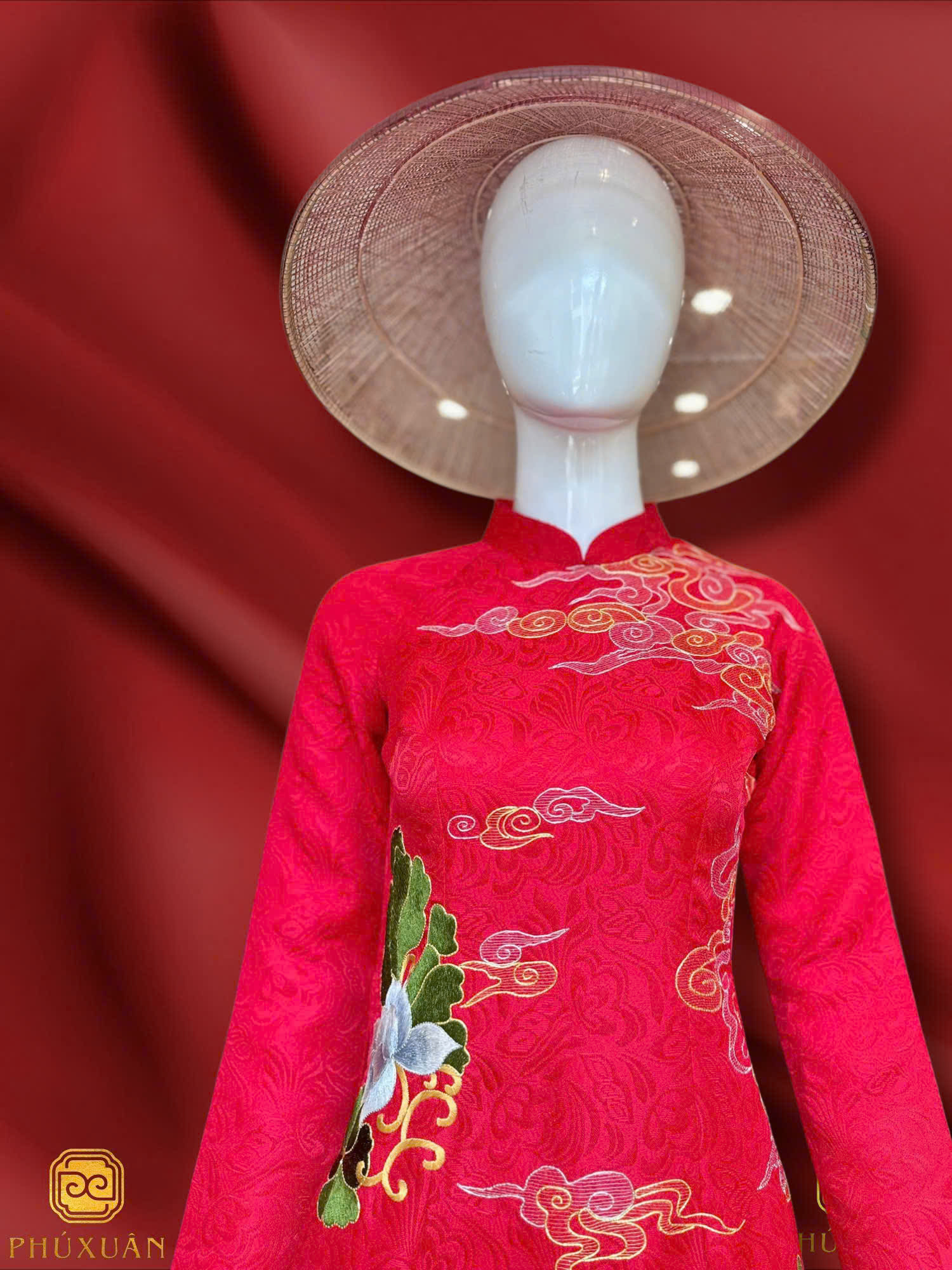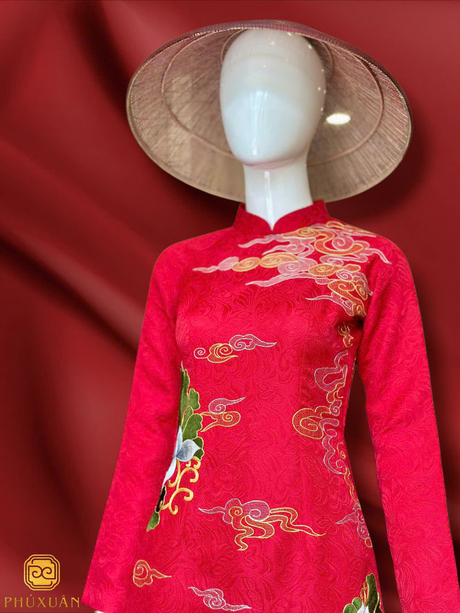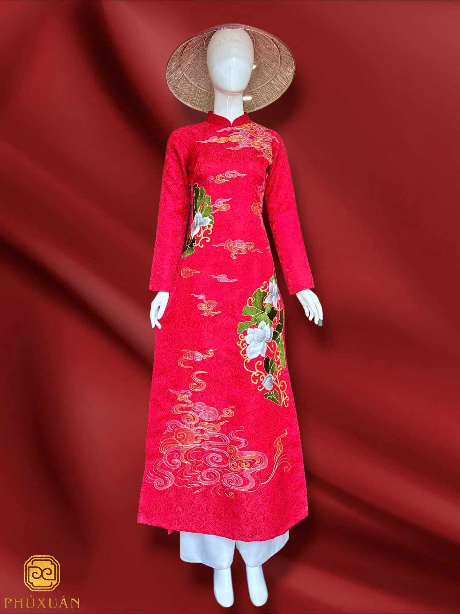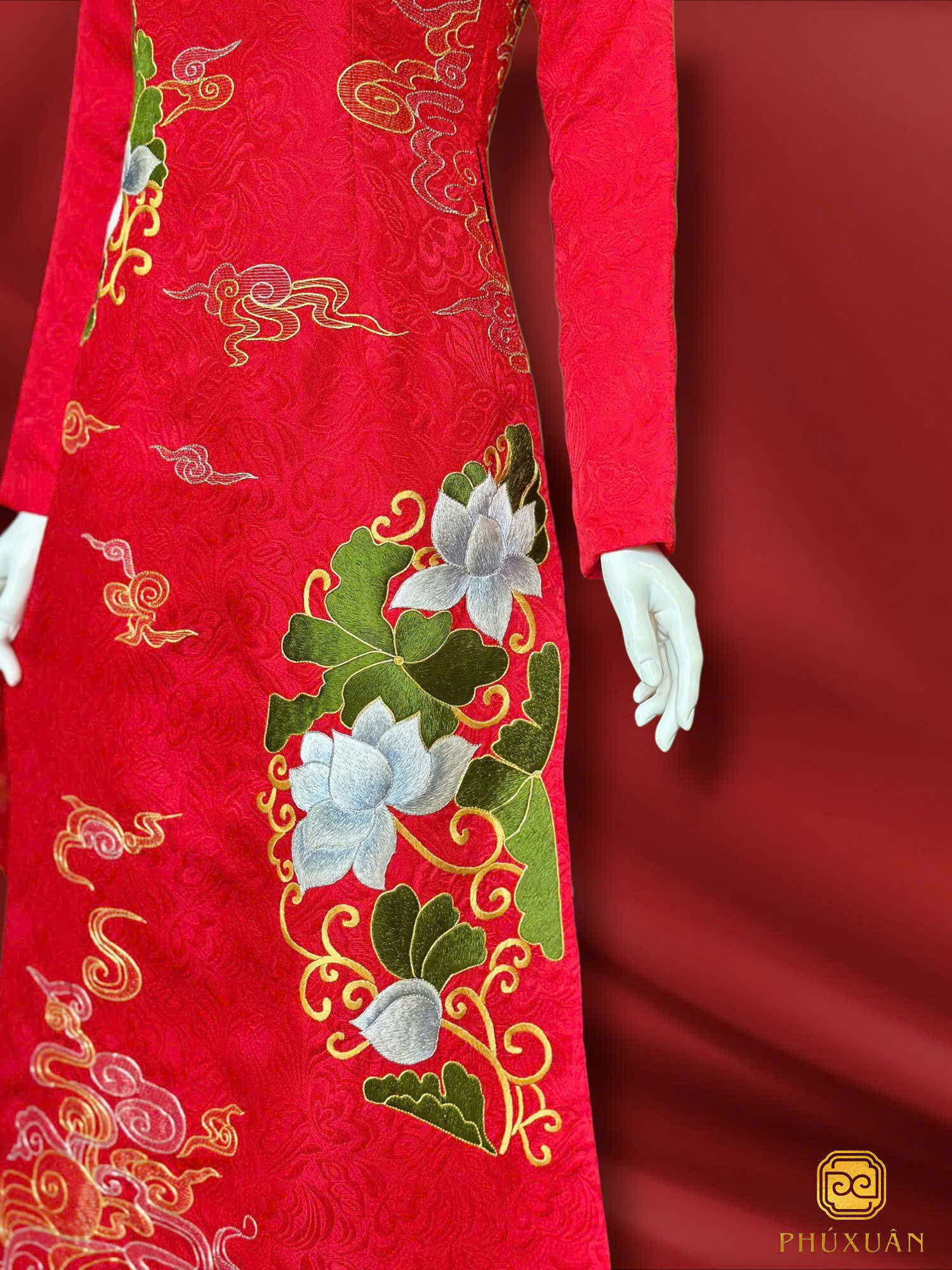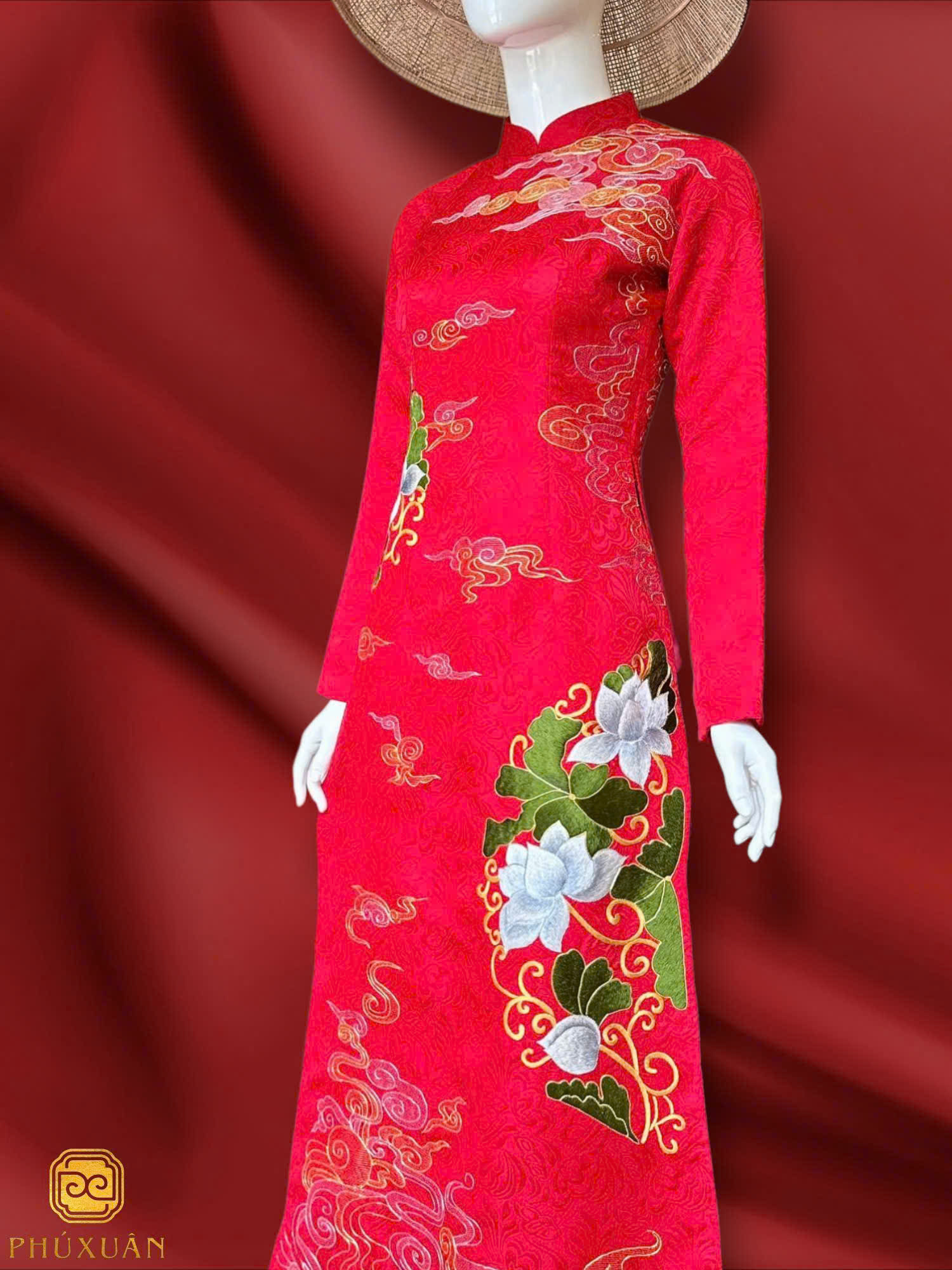 Chiếc áo dài thêu tay truyền thống với họa tiết hoa sen và mây là biểu tượng của sự thanh khiết và an hòa trong văn hóa Việt. Hoa sen – loài hoa vươn lên từ bùn mà vẫn tinh khôi, tượng trưng cho tâm hồn trong sáng và phẩm hạnh của người phụ nữ Việt. Đường mây lượn mềm được thêu tay tinh xảo bao quanh, gợi hình ảnh bầu trời thanh thoát, mang đến cảm giác nhẹ nhàng và bình yên. Trên nền lụa mềm mại, từng đường kim mũi chỉ như hòa quyện giữa đất và trời, con người và thiên nhiên, tạo nên một tác phẩm không chỉ đẹp mắt mà còn chứa đựng hồn Việt sâu lắng và giá trị văn hóa trường tồn.