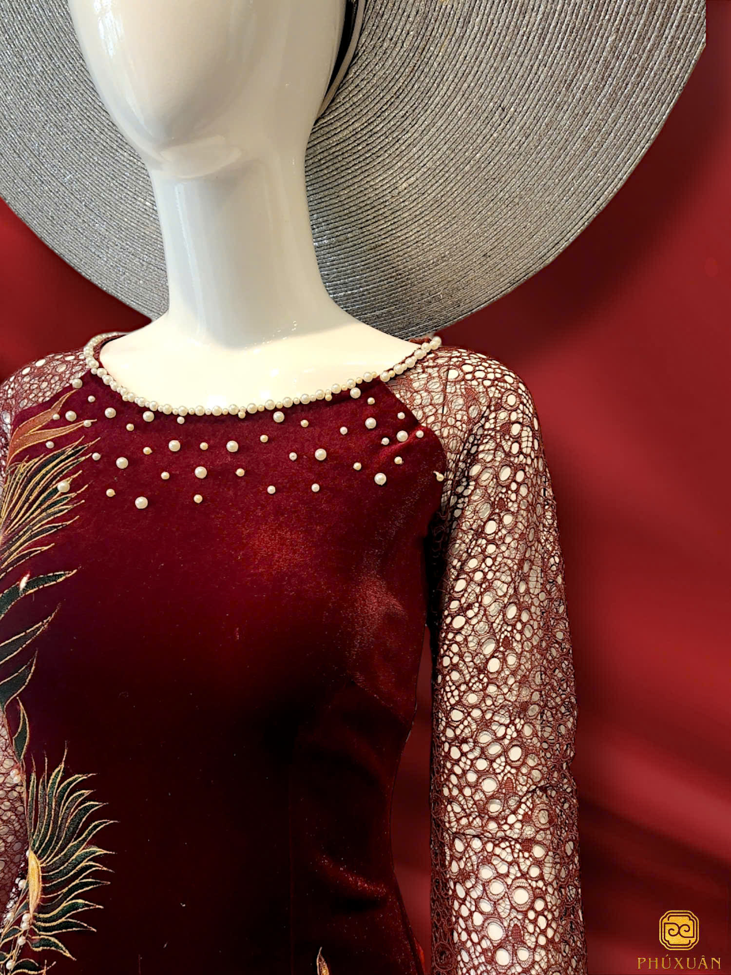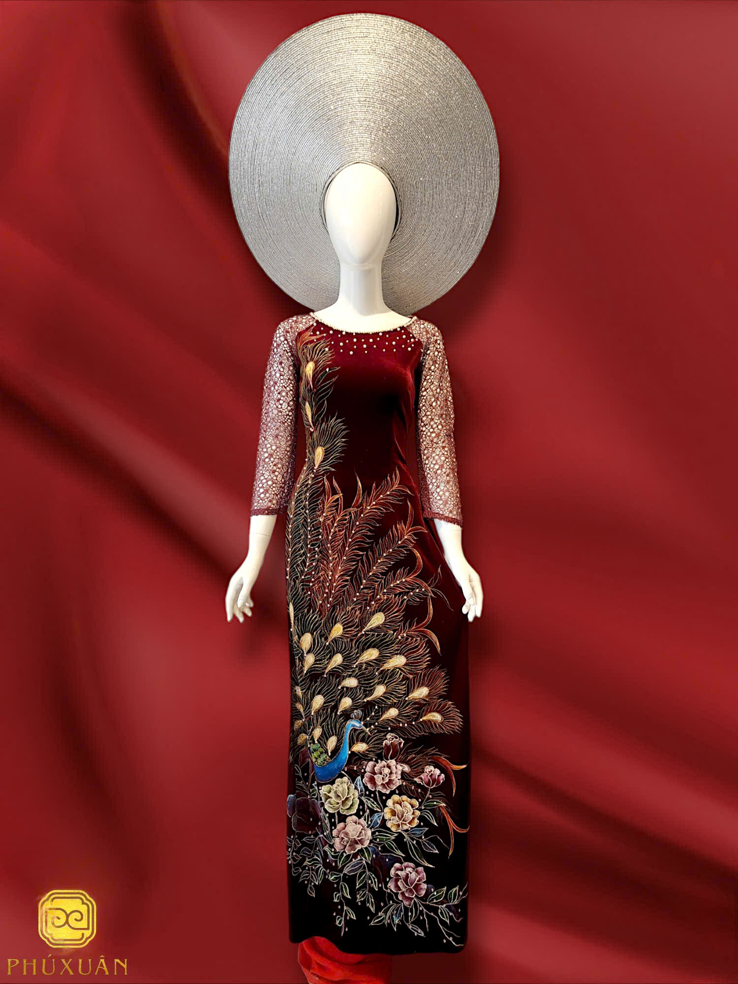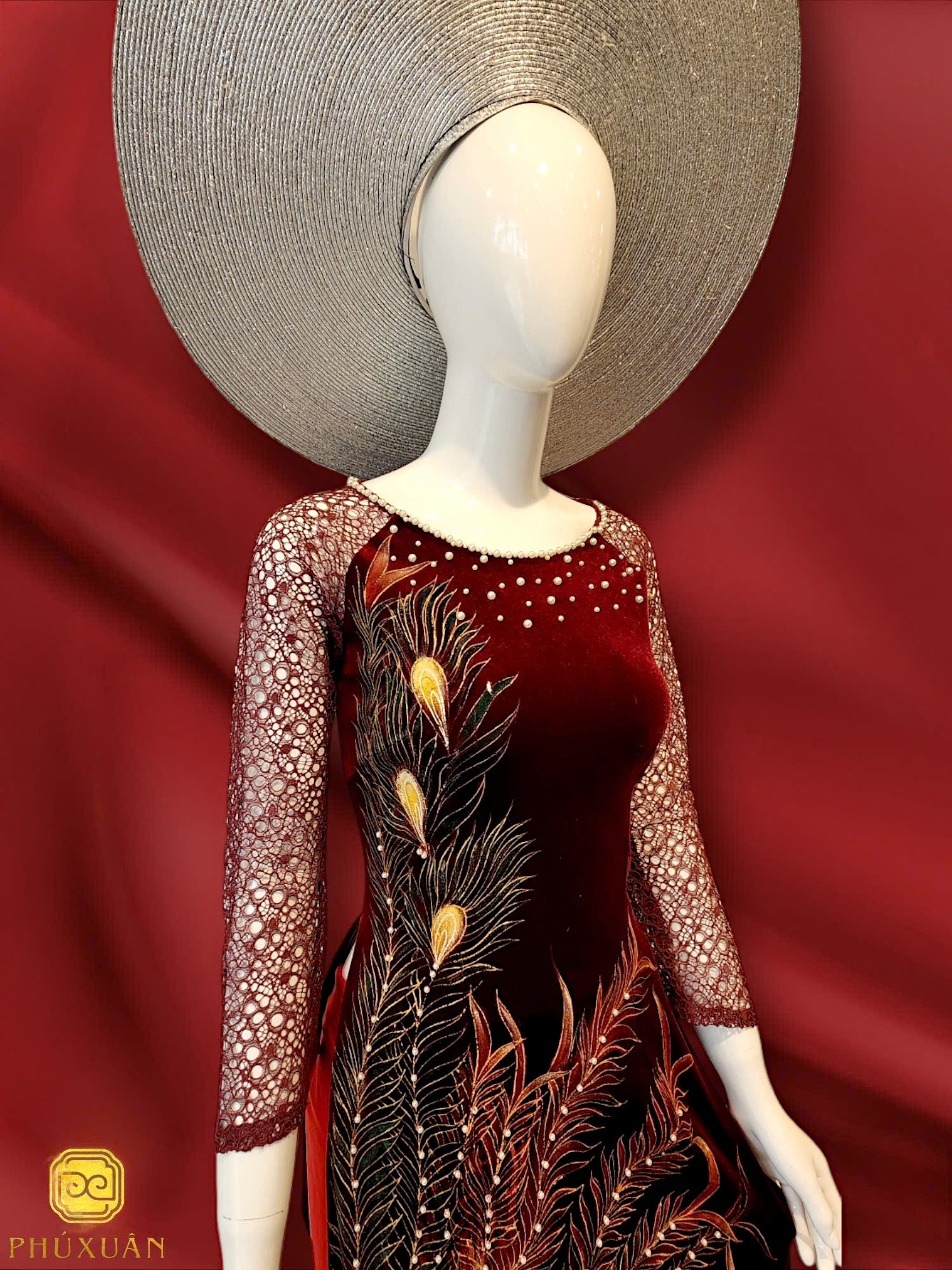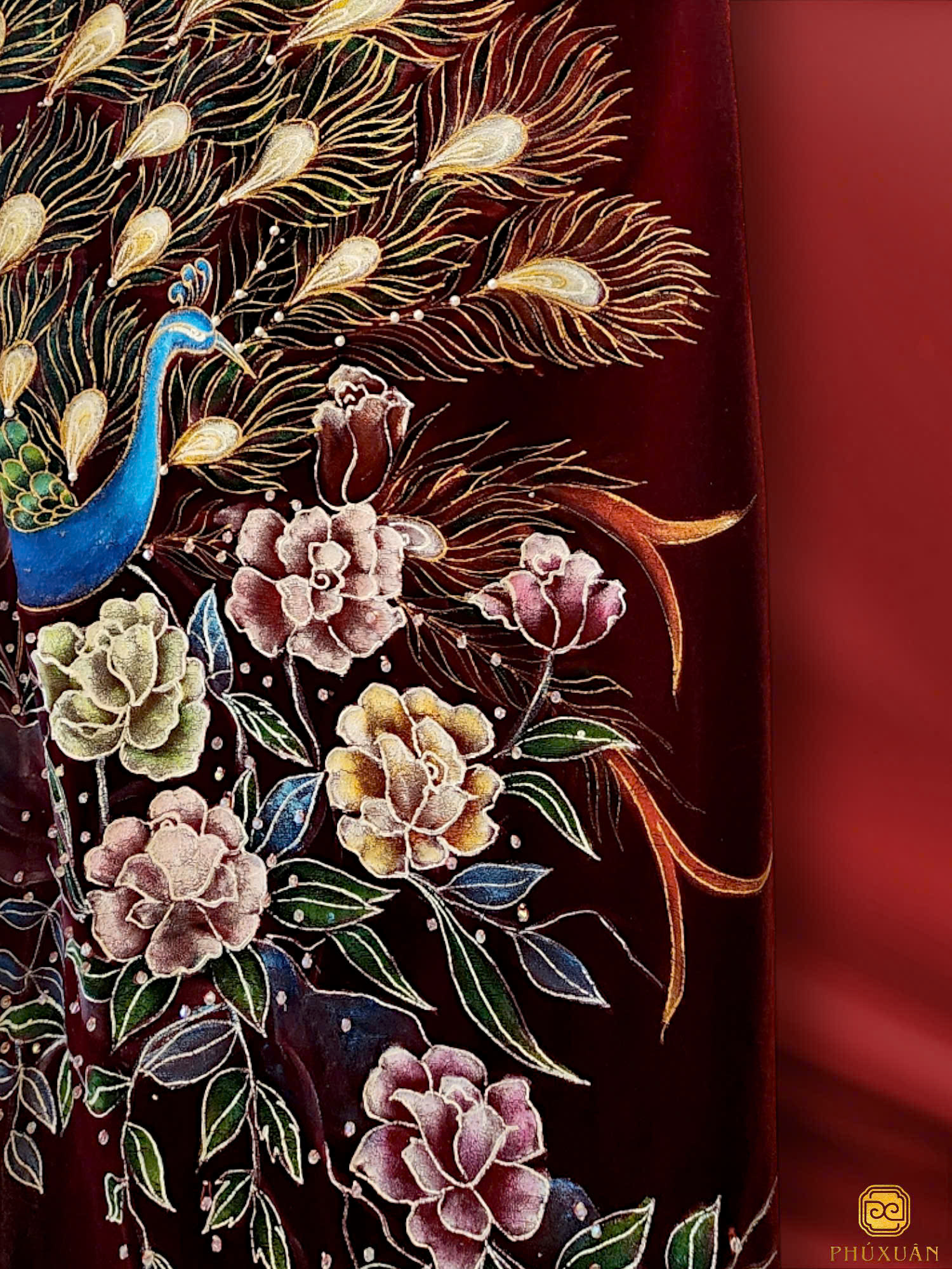 Chiếc áo dài nhung vẽ tay mang vẻ đẹp sang trọng và sâu lắng, kết hợp giữa chất liệu nhung mềm mịn và nghệ thuật vẽ tay tinh tế. Trên nền vải óng ánh, từng họa tiết được khắc họa nhẹ nhàng, tạo chiều sâu và cảm xúc. Mỗi tà áo là một tác phẩm nghệ thuật mang hơi thở cổ điển, tôn vinh nét đẹp quý phái, kiêu sa nhưng vẫn đậm đà bản sắc Việt.