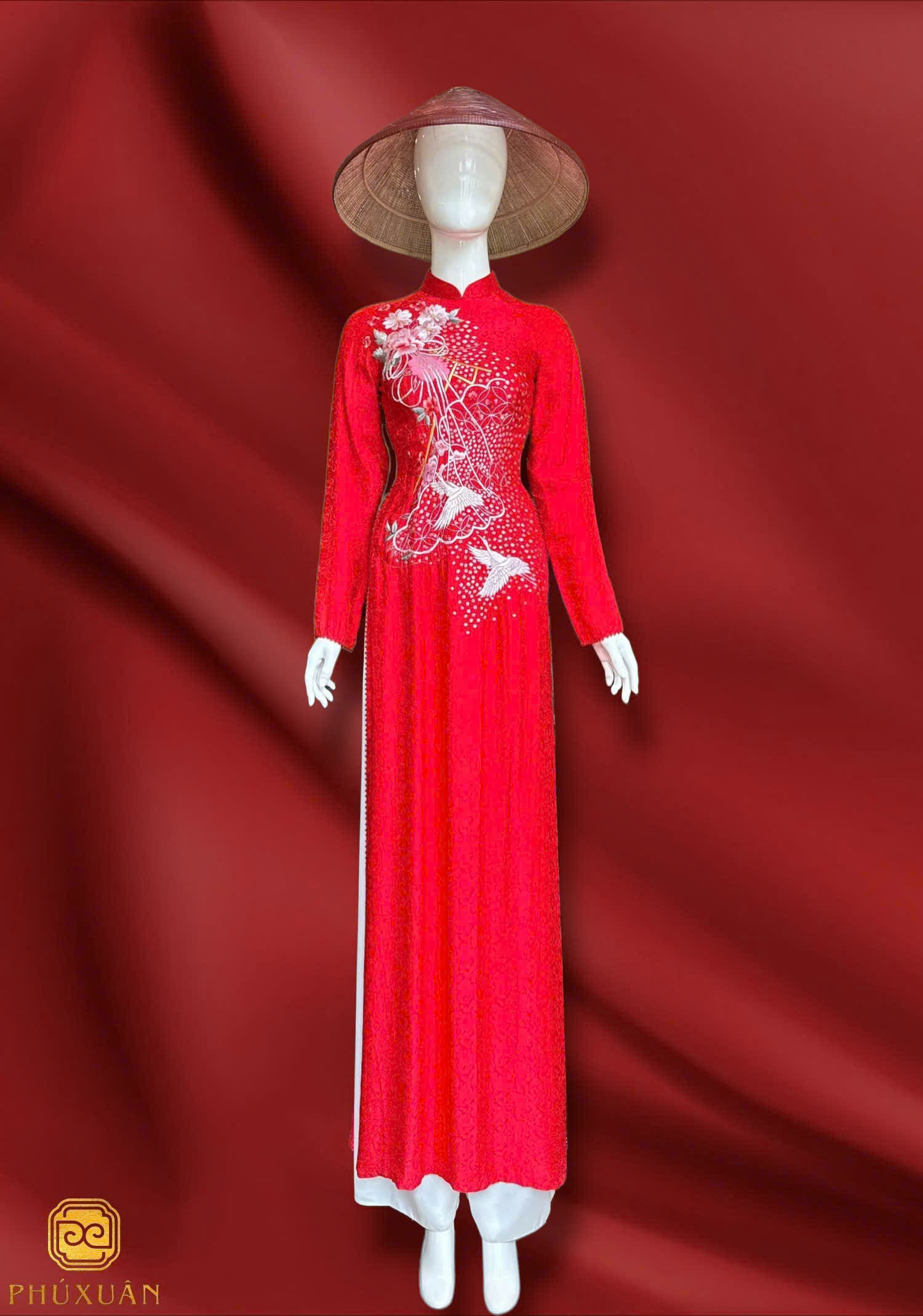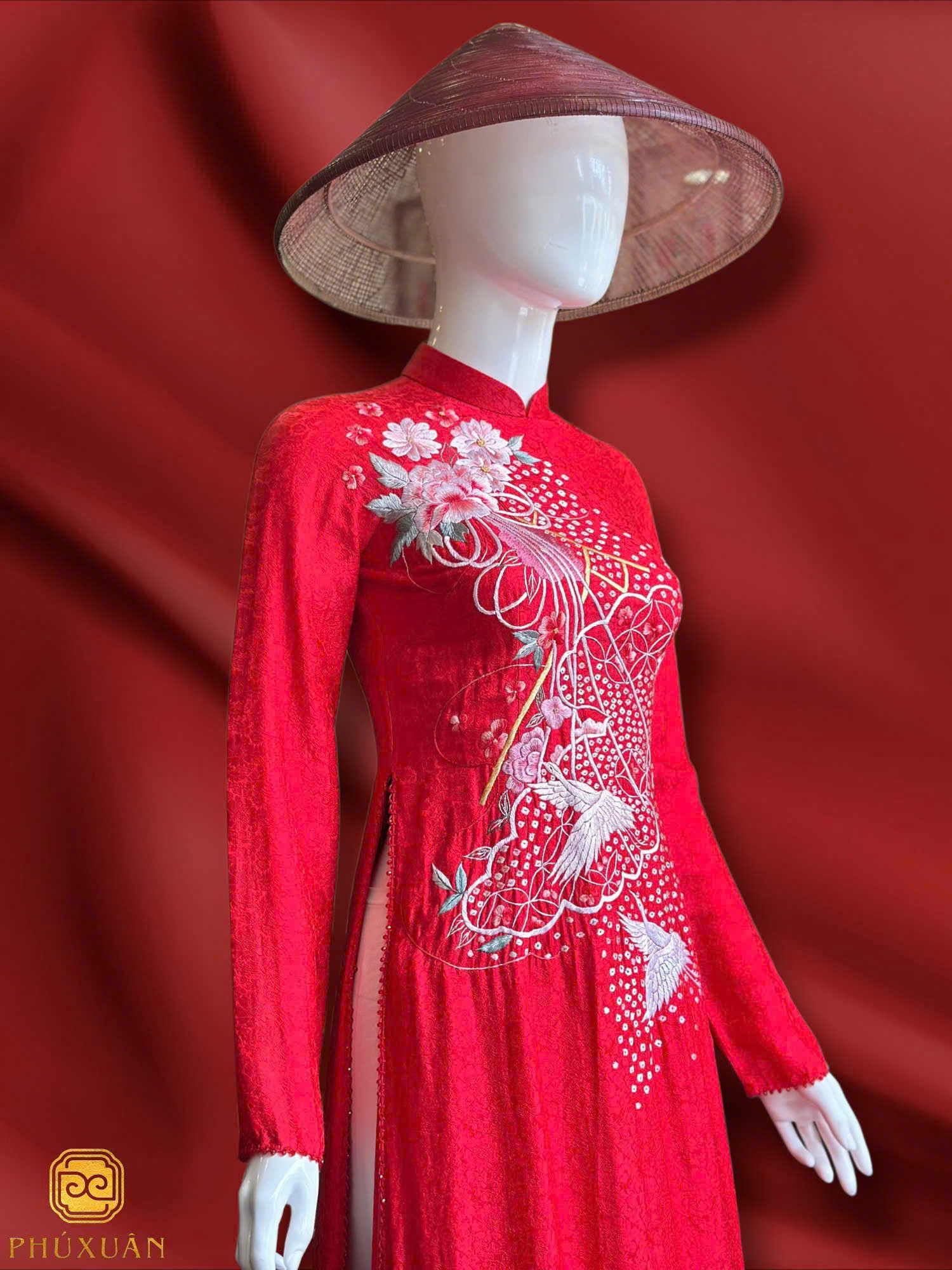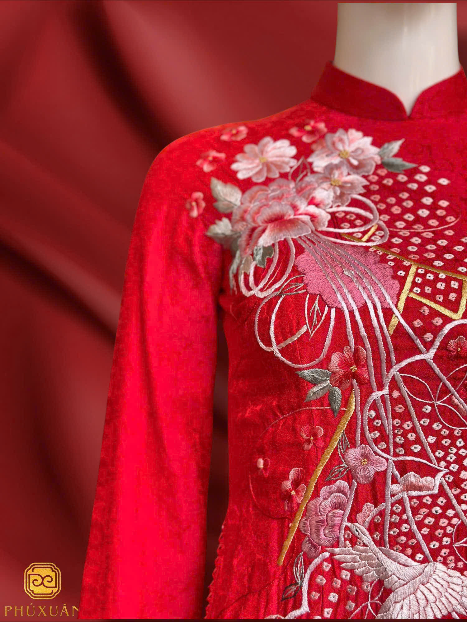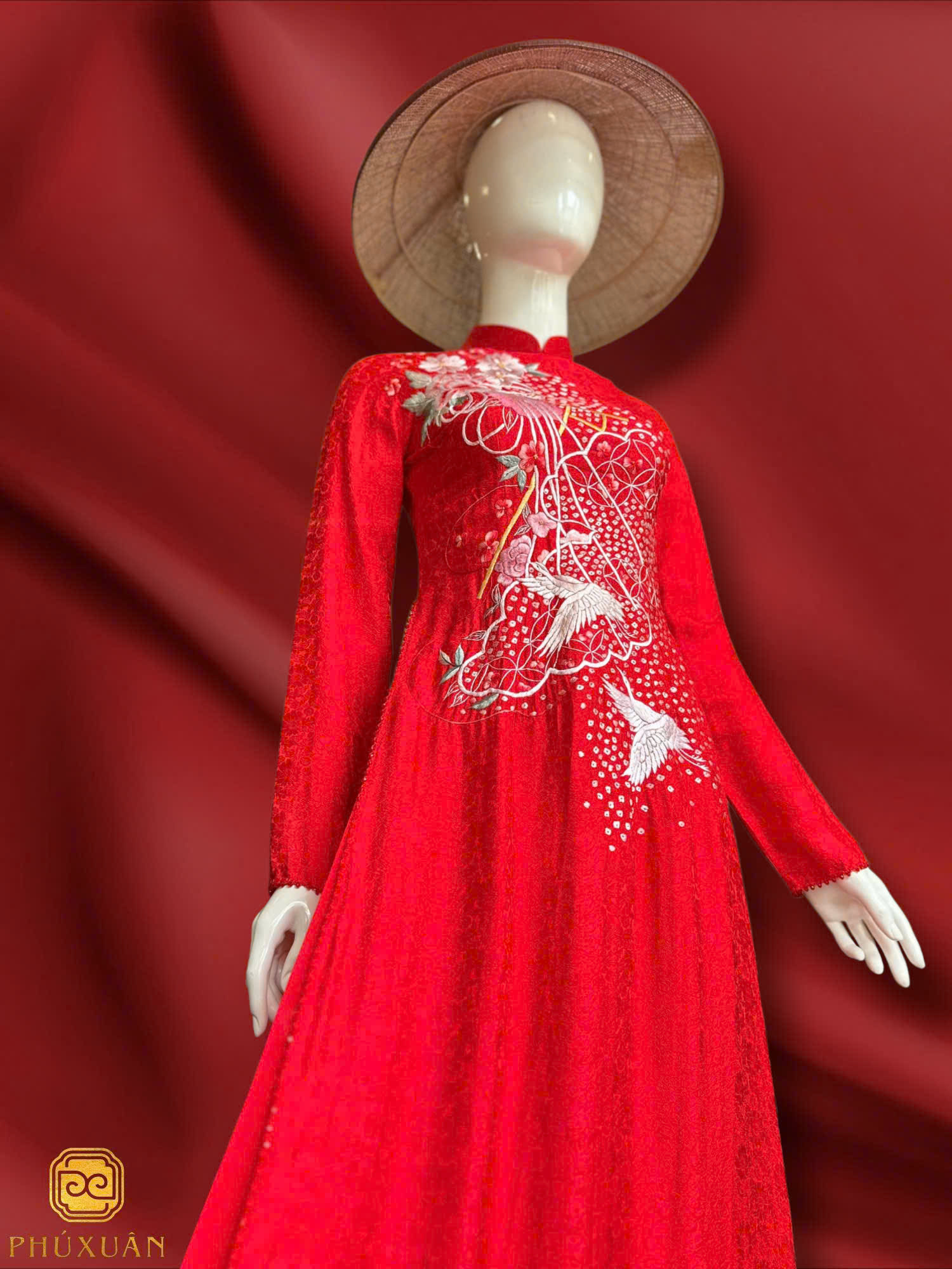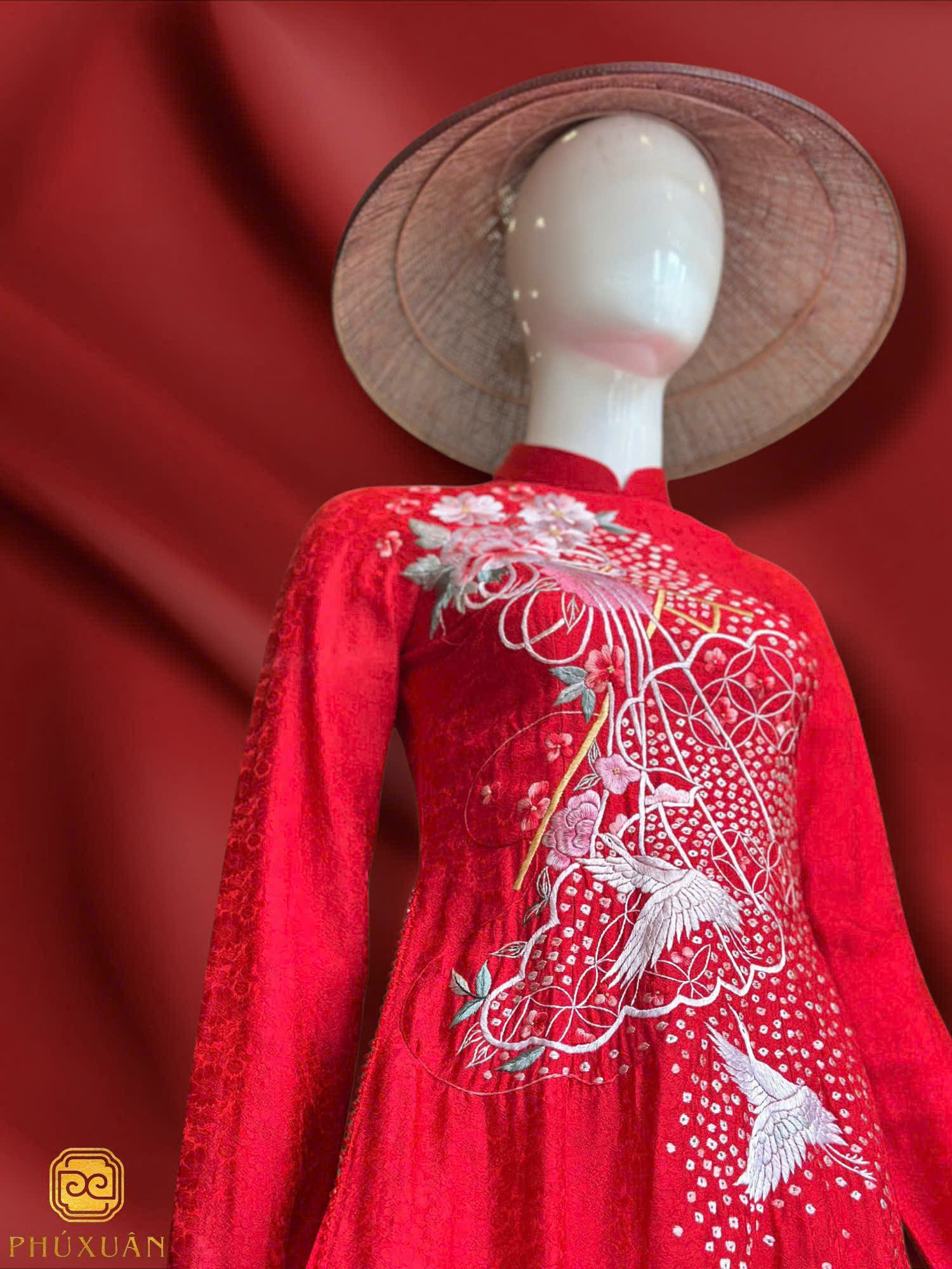 Áo Dài Thêu Tay Truyền Thống – Họa Tiết Chim Hạc và Hoa Cách Tân Phối Hợp